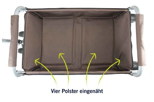 - Eingenähte Polsterung im Textilkörper. Vorne, hinten und im Boden