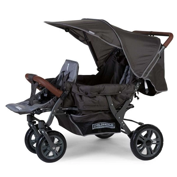 Der Childhome Drillingswagen ist ideal für eine Familie mit drei kleinen Kindern. Maximale Flexibilität bieten die Räder mit einem guten Halt auf der Straße und für Sicherheit sorgt die Zentralbremse im Heck mit dieser kann der Childhome Kinderwagen problemlos zum Stillstand gebracht werden. Auch die Kinder sich sicher mit dem 5-Punkt-Sicherheitsgurt im Kinderwagen angeschnallt. Dabei müssen sie nicht auf Komfort verzichten, denn die Rückenlehnen sind verstellbar, somit ist auch ein Nickerchen unterwegs kein Problem. Der Ablagekorb unterhalb der Sitze bietet Ihnen viel Platz um alles was Sie unterwegs benötigen zu verstauen. Im Lieferumfang ist auch eine praktische Regenhülle enthalten, auch das große Verdeck schützt Ihre Kinder vor Sonne und Wind. Die praktischen Taschen unterhalb des Schiebegriffes sind nummeriert und können den einzelnen Sitzen zugeordnet werden. Die Stoffkanten sind mit reflektierenden Streifen versehen und erhöhen die Sicherheit im Dunkeln.