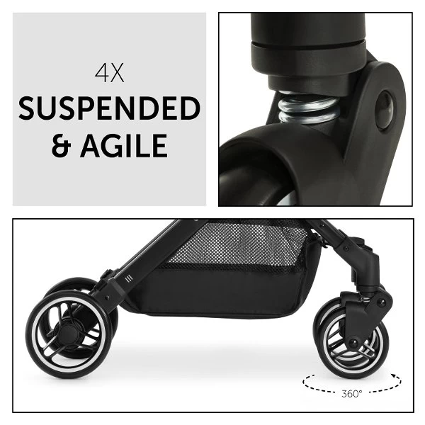 Mit 4-fach stoßgedämpfter Federung und Leichtlaufrädern fährt dein Kind immer sicher. Du meisterst jede Kurve dank der schwenkbaren 360-Grad-Vorderräder. Zum Schlafen bringst du die Rückenlehne mit einer Hand leicht in die Liegeposition. Das Sonnenverdeck mit Sichtfenster (UV-Faktor 50+) bietet Sonnenschutz und du hast dein Baby jederzeit im Blick.