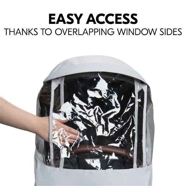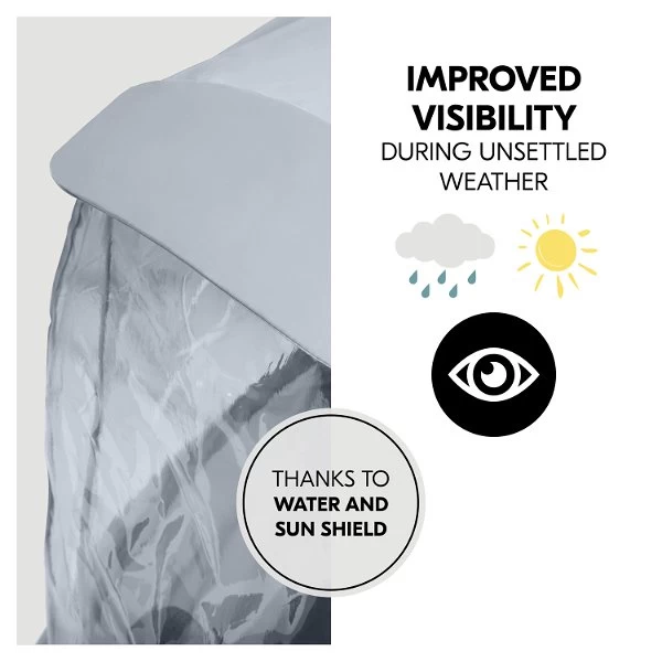 Bei wechselhaftem Wetter mit Regen und Sonne sorgt die Wasser- und Sonnenblende für eine verbesserte Sicht und schützt dein Kind vor Blendung. Das Regenwasser wird entlang der PEVA-Folie schnell abgeleitet und überlappende Sichtfensterseiten ermöglichen es dir, jederzeit in den Kinderwagen zu greifen, ohne das Regenverdeck komplett zu öffnen. Mit den praktischen Druckknöpfen lässt sich das Regenverdeck schnell und einfach auf- und zumachen.