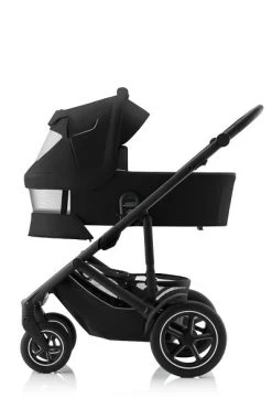 In den ersten Monaten verwenden Sie die Babytragetasche als Transportmittel für unterwegs. Diese wird einfach auf den Wagen gesetzt, eine weitere Befestigung ist nicht nötig. Die Tragetasche wird sicher von der abgewinkelten Fußstütze gehalten. So sparen Sie Zeit wenn es doch mal etwas eilig sein sollte. Zum schnellen Verstauen des Kinderwagens im Auto, lassen sich die Räder besonders schnell abstecken.